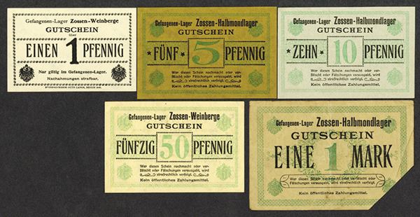 Germany. WWI POW Camp Money. 1, 50 pfennig; 5, 10 1 Mark. First four Choice Uncirculated, the 1 Mark is VF+ with a corner clip as often seen. 5 pieces.