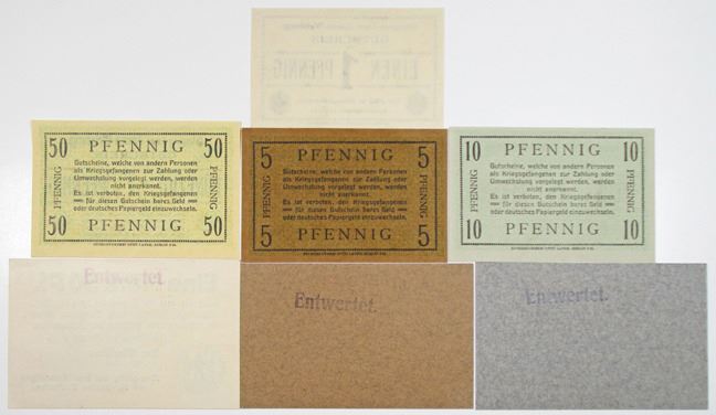 Germany. 1914-17. Lot of 7 Issued Notgeld. Zossen-Weinberge: 1 Pfennig; 5 Pfennig; 10 Pfennig; and 50 Pfennig. Zullichau: 1 Mark 50 Pfennig; 2 Mark; and 5 Mark. All are in VF to Uncirculated condition. (7)