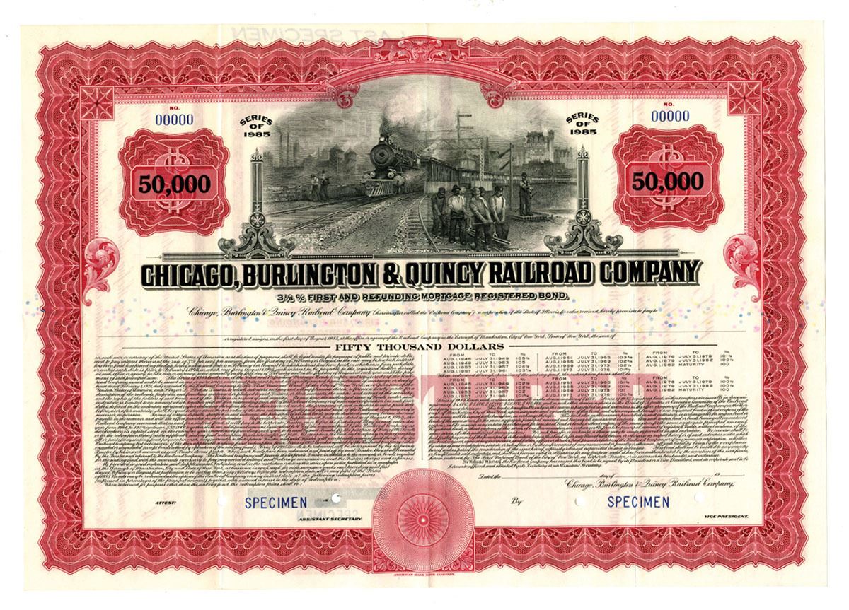 Illinois. $50000 Specimen 3 1/8% 1st and Refunding Mortgage Registered Bond, Black print on red/pink border and under tint in a horizontal format, Image of locomotive coming around the bend with men carrying a railroad tie, Specimen overprints, POC's, VF-XF condition, ABNC. Listed Railroad on Cox, but Unlisted Bond type.