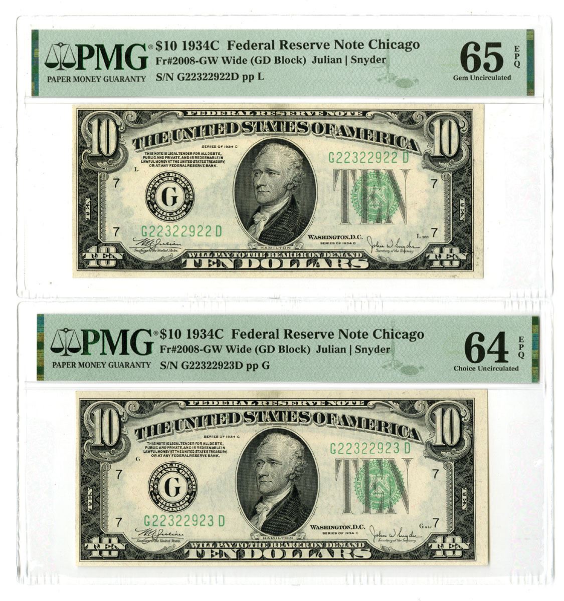 Chicago, Illinois, 1934. $10, Series of 1934C, Fr.# 2008GW Wide (GD Block) Sequential Issued Banknote Pair, Julian | Snyder Signatures, Small green seals at right, S/Ns G22322922D pp L and G22322923D pp G, Both are PMG graded - One is Gem Unc 64 EPQ and the other is Gem Unc 65 EPQ. (2).